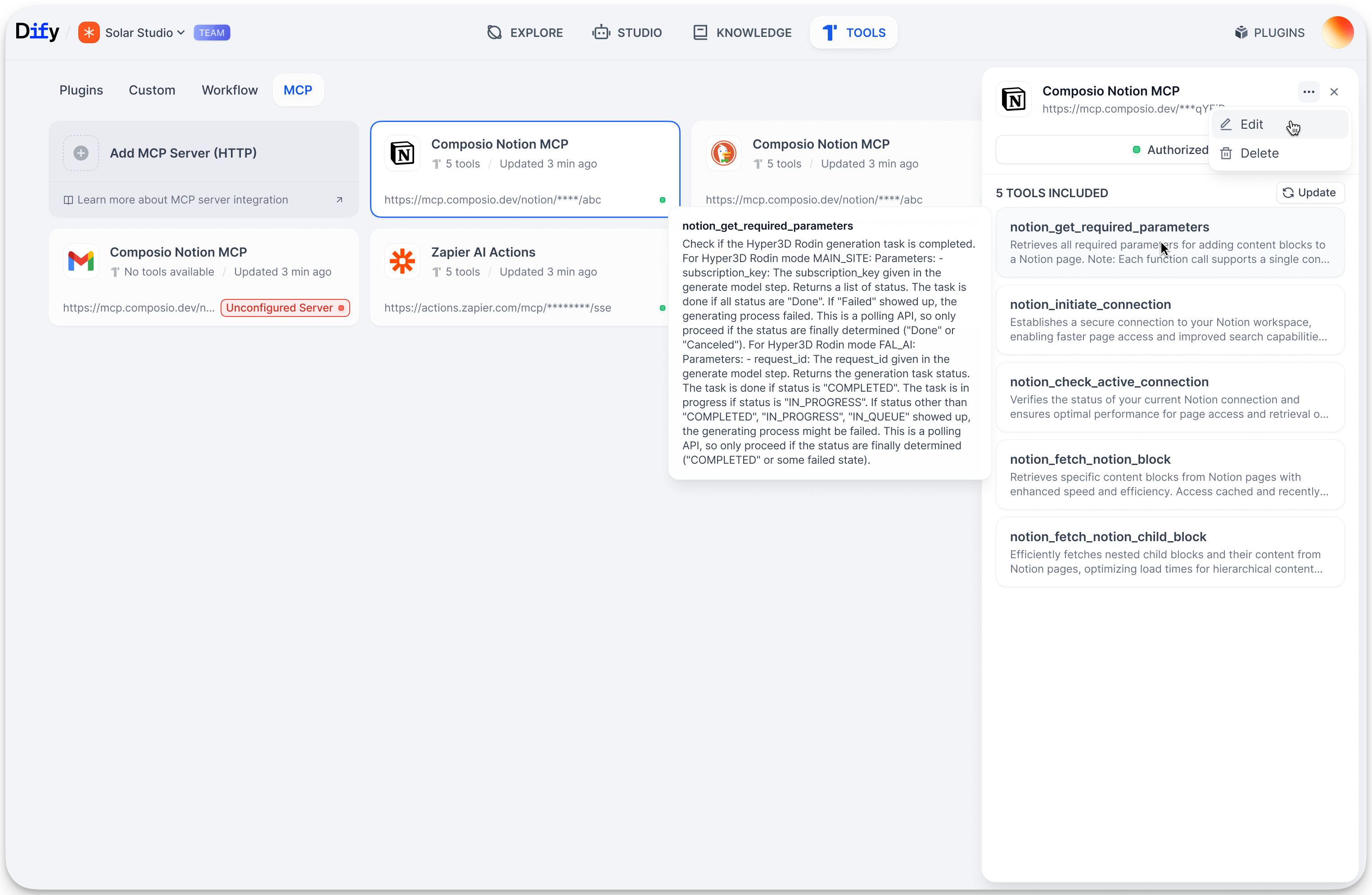 在智能代理中:工具按服务器分组显示("Notion MCP » Create Page")