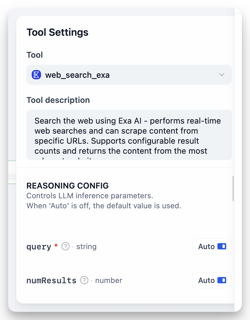 示例:对于搜索工具,将 numResults 设置为 5(固定),但保持 query 为自动。